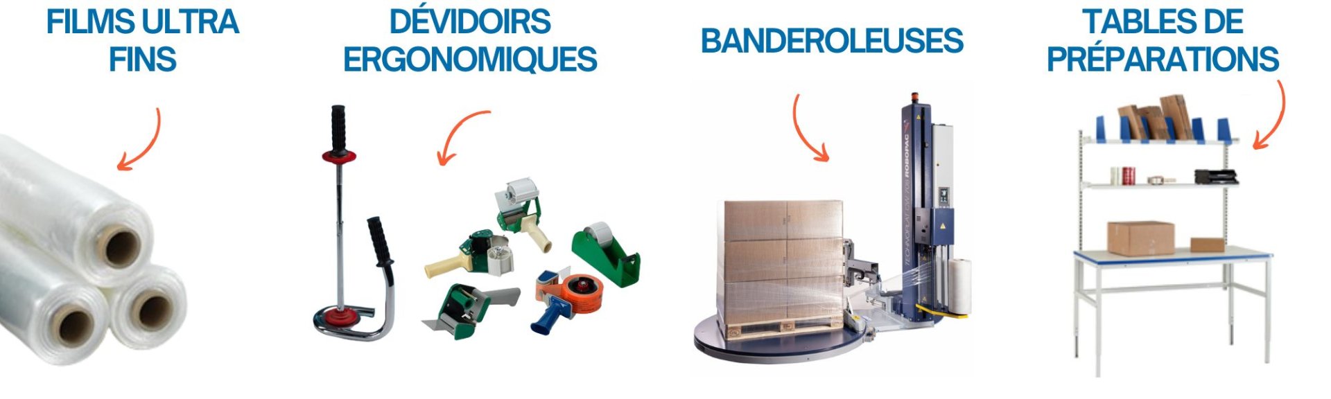 Les films étirables légers, les banderoleuses automatiques, les dévidoirs ergonomiques et les tables réglables sont des solutions efficaces pour limiter les gestes répétitifs et les postures contraignantes.